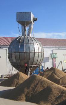 3、在烘干過程中,稻谷緩慢下落由頂部風機將稻谷從烘干機底部循環提入料風分離器,再由鎖風料管自然落入大球體內,球體內稻谷在勻速運動中被烘干。